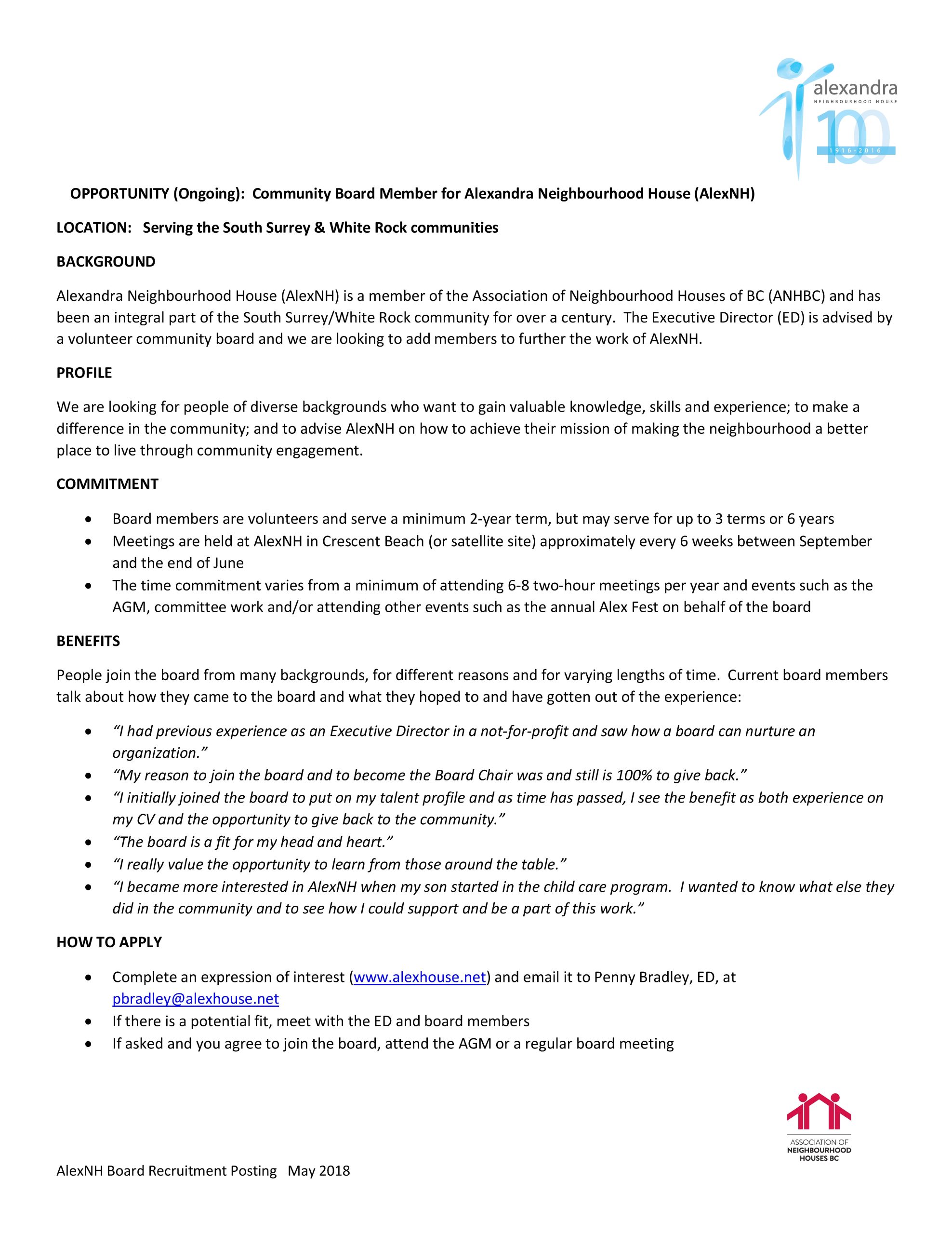 Alexandra Neighbourhood House is looking for people who have a passion for community building, an interest in strengthening diversity and inclusion in their neighbourhood, and the unique skills necessary to contribute to Alexandra Neighbourhood House’s vision for ‘a caring, inclusive and vibrant community’.