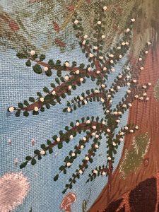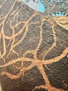When it came time to create the painting, I knew I wanted to showcase those interconnections. I used a sand-textured medium to give life to the earth and roots, just as the ground below our feet gives life to all. I used glass beads for the berries to accentuate the vibrance and the excitement that comes with foraging. I believe that my execution of this painting captured the ecosystems of our forests beautifully and shows we are all one.